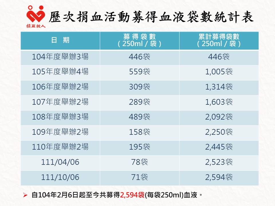 根據捐血中心資訊,不久前某團體已在中興新村舉辦了大型的捐血活動,因此才會造成上週以及本次在惠德宮的捐血活動人數不如過往般踴躍。即便如此,草屯在地的鄉親仍然十分熱情,不少人挽袖捐出500c.c.血液,為短缺的血庫挹注存量。在眾人的努力下,共募集到71袋(每袋250ml)熱血。